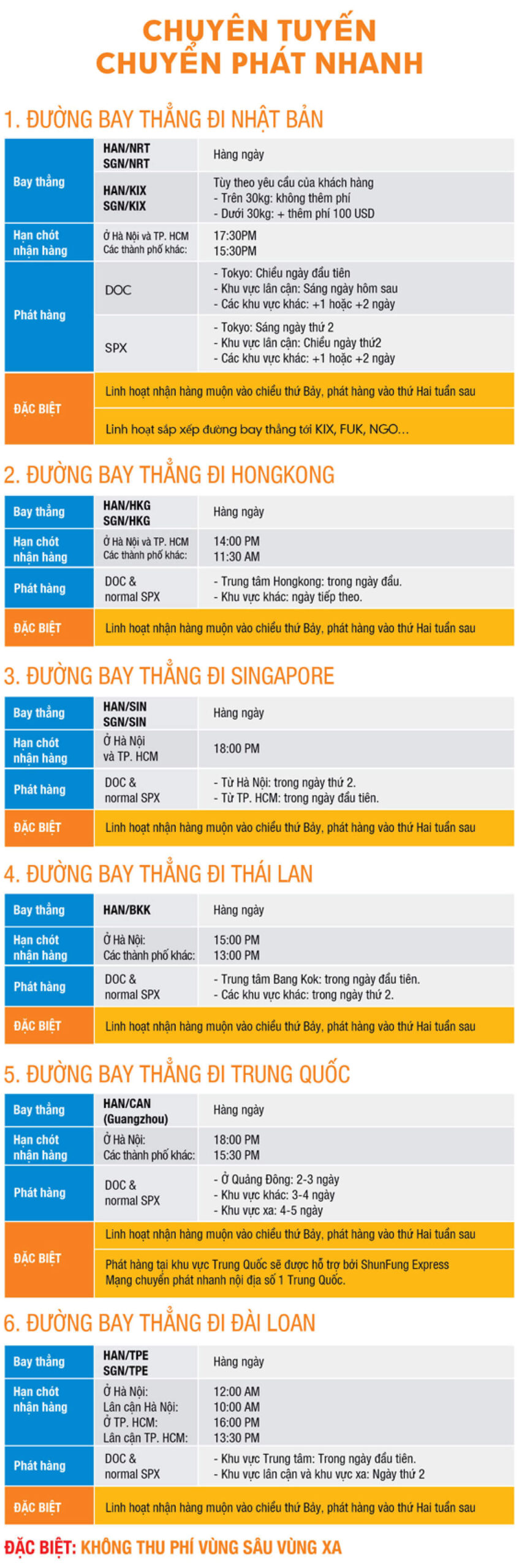 Chúng tôi là đối tác chiến lược của các tập đoàn chuyển phát nhanh hàng đầu thế giới như OCS (Nhật Bản), CityLink (Malaysia)… để hình thành các đường bay chuyên tuyến quốc tế đến Nhật Bản, Trung Quốc, Singapore, Malaysia, Hongkong, Đài Loan… với chất lượng cao, nhanh chóng và chi phí cạnh tranh, thông quan trực tiếp tại các cửa khẩu sân bay Tân Sơn Nhất, Nội Bài. Đặc biệt, khách hàng có thể lựa chọn hình thức phát hẹn giờ tùy theo yêu cầu. Chi tiết các chuyên tuyến như sau: